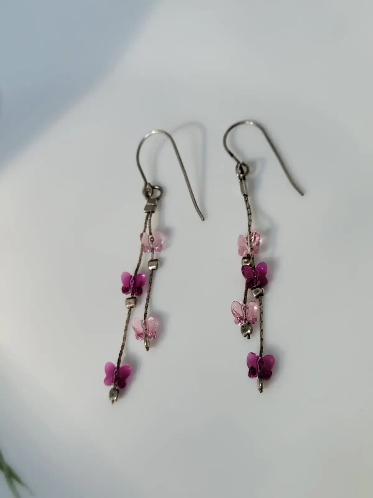 עגילי כסף 925 נופלים, בשילוב אבנים ורודות בצורת פרפרים